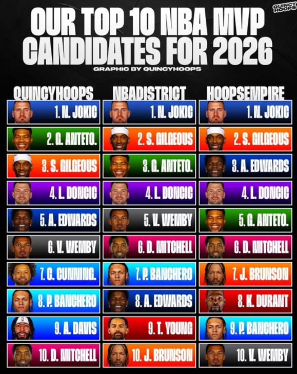 近日,美国媒体Quincy Hoops、NBA District、Hoops Empire评选出25-26赛季常规赛MVP前十名名单。这三大美国媒体心目中的前十排名各有不同,但已经不包括即将年满41岁的勒布朗,也不包括37岁的库里。昆西篮前十候选:1.约基奇、2.扬尼斯、3.亚历山大、4.东契奇、5.爱德华兹、6.本亚马、7.坎宁安、8.班凯罗、9.浓眉、10.米切尔; NBA分区前十候选人:1.约基奇、2.亚历山大、3.扬尼斯、4.东契奇、5.本亚马、6.米切尔、7.本奎罗、8.爱德华兹、9.特雷杨、10.布伦森;篮球帝国前十候选人:1.约基奇、2.亚历山大、3.爱德华兹、4.东契奇、5.扬尼斯、6.米切尔、7.布鲁恩森、8.杜兰特、9.本奎罗、10.文班亚马。美国三大媒体将东契奇排名第四。马特减肥后,东契奇依然没能打动美国媒体。这与湖人队的阵容深度有关。这在季前赛就能看出,没有东契奇和詹姆斯的湖人队依然是一支弱队。东契奇陷入了球队战绩的困境。 40岁的詹姆斯上赛季在最佳二队+MVP投票中排名第六。詹姆斯在20年前也是十六年选票。然而美国三大媒体却将41岁的勒布朗排除在前十MVP之外。詹姆斯真的下滑太多了吗?篮球帝国将杜兰特排在第八位。他们也是唯一一支选择KD的球队。杜兰特个人数据场均25+5+5当然是没问题的。考虑到火箭队的战绩可能会继续跻身西部前三,所以支持杜兰特进入前十MVP候选人的人似乎并不多。 37岁的库里想要进入MVP前十非常困难。无论是他球队的战绩,还是他数据的稳定性,这都是一个巨大的问号。这支矮人阵容能成为西丙老阵容的强队吗会议?